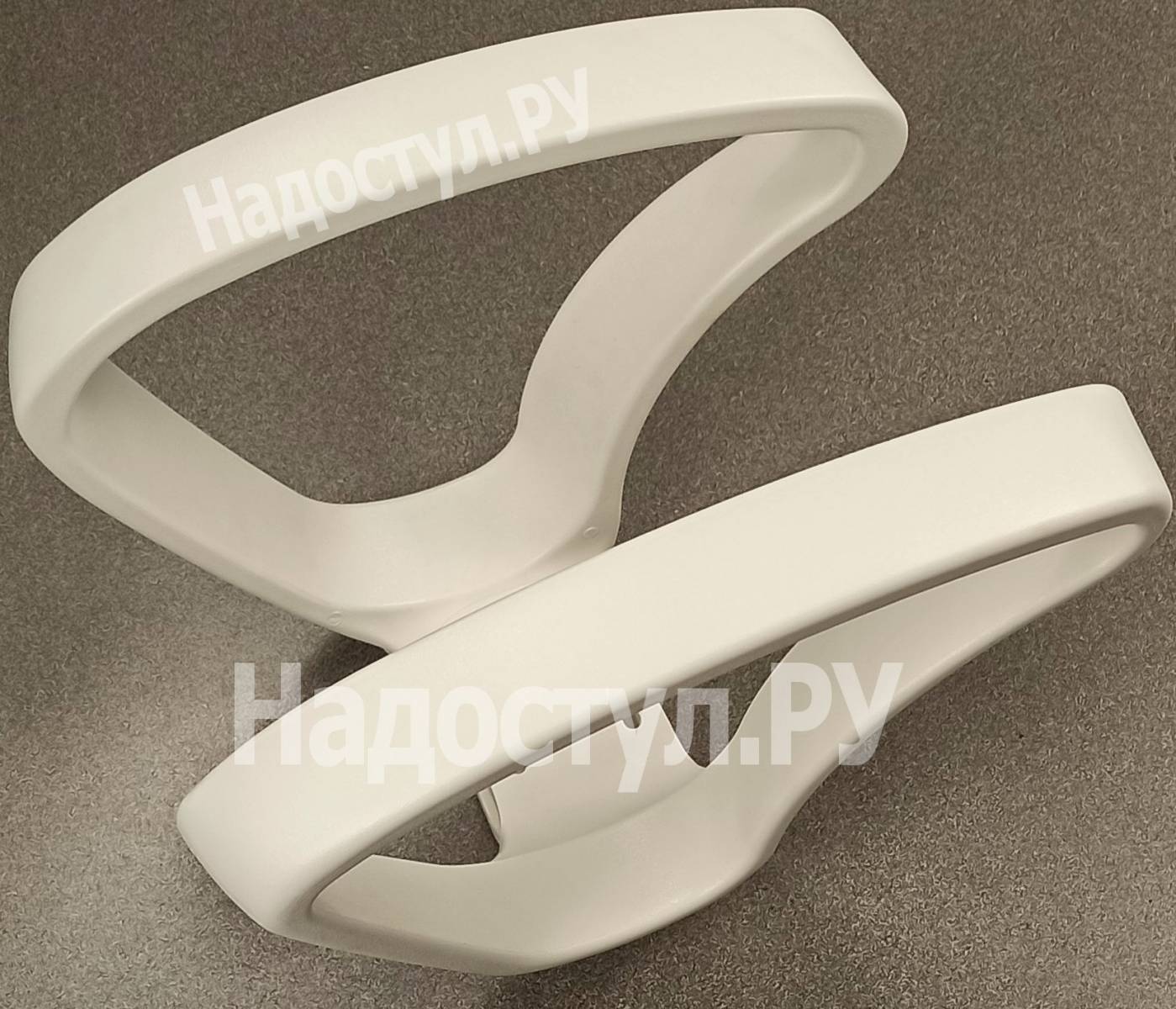 • Пара белых каплевидных пластиковых подлокотников для офисного кресла.